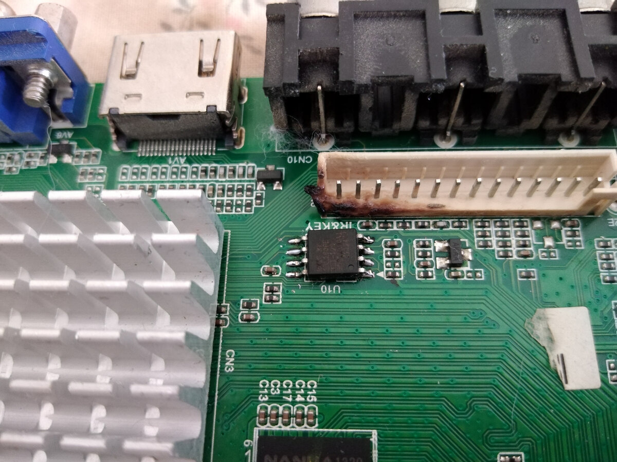 RAM: NT5CB256M8FN-D1 - 2шт При внешнем осмотре майне обнаружил паяную до меня микросхему памяти SPI. Выпаял микруху и вычитал с неё дамп. Оказалось что спиайка пустая (в смысле забита F-ками). Делать нечего, будем шить память. Новых 16-мегабайтных микрух не нашлось и я решил заменить MX25L1606E на 25Q32FVSIG. Проблема в том что эта модель телевизоров выпускалась с 5 разными матрицами. Плюс к этому были майны с разными ревизиями, на одних был установлен NAND TC58NVG4D2HTA00 а на других eMMC THGBM5G5A1JBA1R. Из свободных источников скачал архив с 5 дампами SPI и 1 firmware USB. Прошил SPI дампом под мою матрицу и запаял на место. Ииии…. Вообще ничего не п