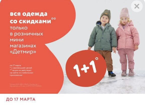 Акция в Детском мире 1+1 на детскую одежду со скидками до 17 марта❗️❗️❗️