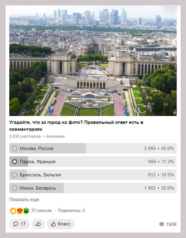 Выложив в Одноклассниках опрос с видом с Эйфелевой башни на деловой квартал французской столицы Ля Дефанс, я очень сильно удивилась, что многие приняли его за Москва-Сити! За такой вариант проголосовало большинство. Минск, кстати, тоже не намного отстаёт, почти две тысячи человек решили, что Дворец Шайо - это ворота Минска. В Ля Дефанс трудится 150 тысяч