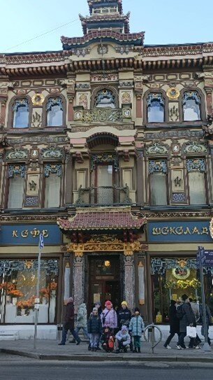 Красочный фасад, напоминающий диковинную шкатулку, изобилует стилизованными накладными деталями из керамики, китайскими иероглифами. Восточный орнамент причудливо переплетается с мистическими л