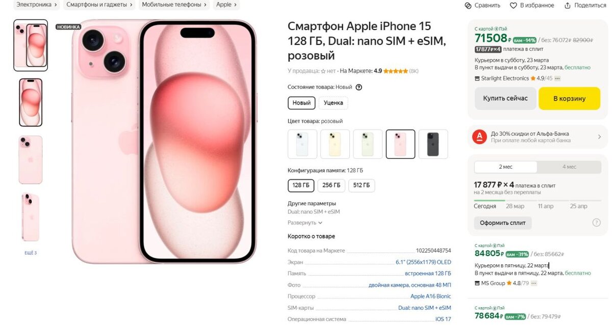 Отмечается, что дешевле остальных стоят модели со 128 ГБ памяти. IPhone 15, представленный в конце 2023 года, значительно снизился в цене. Об этом сообщает Hi-Tech Mail.ru. Журналисты СМИ заметили, что новое устройство подешевело примерно на треть. Если в начале продаж гаджет оценивался в 125–170 тысяч рублей, то в середине марта 2024 года его цена оставляет 80–90 тысяч рублей. «Напомним, что iPhone 15 может похвастаться обновленным корпусом и более быстрым чипом, динамическим островным вырезом и камерой с более высоким разрешением (уже не 12 Мп, а все 48 Мп)» — описывают устройство авторы. Напомним, обновление iOS 17.4 от Apple в первую очередь ориентировано на соответствие европейскому Закону о цифровых рынках. Пользователи из стран ЕС теперь могут устанавливать сторонние приложения, выбирать браузер по умолчанию и использовать сторонние сервисы бесконтактных платежей. ________________ Подпишитесь на наш канал, ставьте лайки и пишите свои комментарии, этим вы поможете донести важную