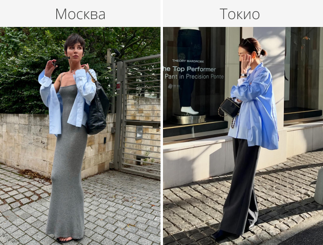 Я работаю редактором моды и давно наблюдаю за мировым стритстайлом. Порой радуюсь действительно удачным аутфитам, а иногда у меня остаются к ним вопросы. Сегодня предлагаю рассмотреть образы девушек из Токио и Москвы. Рубашка прямого кроя Фото блогеров: @mtmmaki, @victoria_solovyeva Я в восторге от того, как модница из Токио стилизовала рубашку. Она надела две, белую и голубую, дополнила образ широкими брюками и обувью на плоском ходу. Для меня это истинный городской шик. А вот аутфит москвички меня немного разочаровал. Рубашка, накинутая на тонкое облегающее платье на бретельках, лишь упрощает и добавляет какой-то пляжный вайб. Я бы заменила ее на более грубую верхнюю одежду, например джинсовку. В этом раунде побеждает японка? Посмотрите Главные тренды весны-лета 2024: большой гид по самым стильным образам (200 фото). Классический тренч Фото блогеров: @ayako_cohina, @fashion.conversation Не скажу, что я в восторге от этих двух образов. У японки не совсем удачно подобрана длина всех