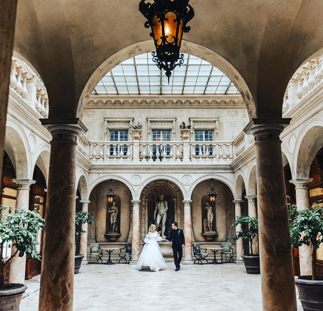 17.03.2024 Пригласили нас на свадьбу в ресторан "Турандот"... Ресторан был открыт в 2005 году, расположен в историческом центре Москвы на Тверском бульваре. Надо сказать, что никакого представления об этом ресторане до той поры у меня не было. Оказалось, что "Турандот" считается одним из лучших ресторанов Москвы. Не берусь об этом судить, но то, что его убранство поражает - бесспорно. Можно сказать, что это - настоящий дворец. Известно, что сотни мастеров из разных стран создавали вручную элементы декора для залов ресторана. Кроме того, в интерьере есть подлинные предметы XVIII века - гобелены, часы, зеркала. В этом ресторане мы были как на экскурсии! Наше внимание разделилось между молодыми и их торжеством и уникальным местом, в котором мы отмечали этот праздник. Первое, что предстало нашему взору-"Флорентийский дворик". Выполнен в стиле итальянского Возрождения. Красивый и просторный, с мраморными копиями античных статуй и подлинными венецианским