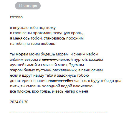 я впускаю тебя под кожу в свои вены прожилки, текущую кровь, я меняюсь тобой, становлюсь похожим на тебя, на твою любовь будешь морем моим ты и синим небом зябким ветром и снежной пургой, дождём лучшей самой из мыслей моих, Эдемом жаром белых пустынь раскалённых, костра огнём если я вдруг найду тебя я задохнусь тобою до потери сознания, счастья, я буду тебя до дна пить, ты смоешь холодной водой ключевою всё плохое, всю грязь, весь нагар с меня