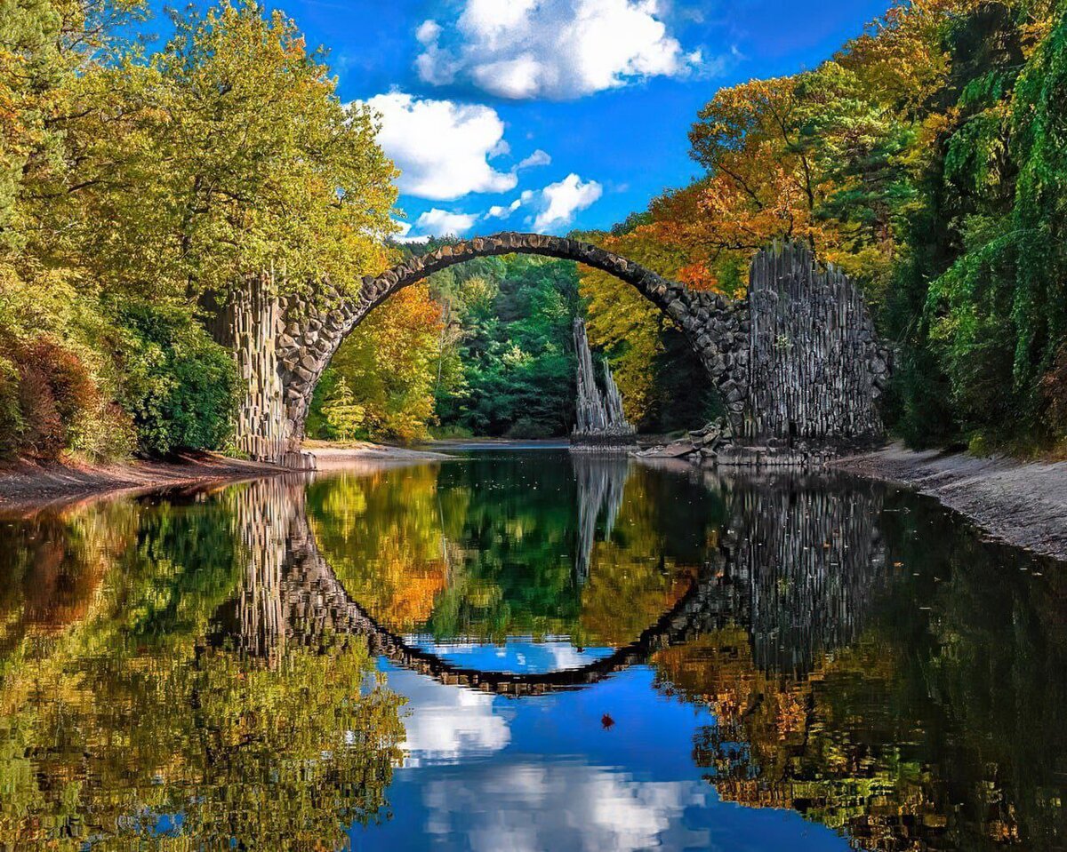 В мире есть много завораживающих и манящих своей таинственностью мест. Одно из таких находится в дендропарке немецкого городка Габленц, что в Саксонии. Мост Ракотцбрюке (Rakotzbrücke), построенный в 1860-м году, окутан множеством легенд и тайн. Почему его называют Чертовым мостом, и что будет с теми, кто пройдет по нему, вы узнаете из этой статьи. Необычный арочный мост Ракотц был построен из базальта неподалеку от границы с Польшей. Такого материала в здешних местах никогда не было, его пришлось везти из далекой Швейцарии и Богемии. Из этой же породы вручную собрали базальтовые скалы, гроты и пирамиды, которые с тех пор украшают территорию парка. Имени архитектора, создавшего этот необычный арочный мост, история не сохранила. Но говорят, что при строительстве он заключил сделку с дьяволом, и тот завершил проект вместо него в обмен на душу первого, кто пройдет по мосту. Но архитектор решил схитрить и пустил по мосту собаку. Так обманутый злой дух остался без награды. Разгневанный, о