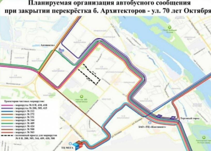 Совсем скоро, в ночь с 23 на 24 марта, в Омске могут перекрыть перекрёсток улицы 70 лет Октября с бульваром Архитекторов. Информацию об этом опубликовал телеграм-канал «Омский форум». Перекрытие, вероятно, связано с продолжающейся реконструкцией бульвара Архитекторов; ранее мэрия сообщала, что работы на этом перекрёстке начнутся весной 2024 года. На время работ общественный транспорт пустят в объезд: по Дмитриева и Крупской. В телеграм-канале выложена карта переноса маршрутов, из которой можно сделать вывод, что несколько микрорайонов в центре Левобережья останутся без транспортного сообщения. Изменения затронут маршруты 3, 14, 21, 24, 64, 78, 8, 410, 418, 200, 305, 415, 424, 500, 503, 409, 331, 213, 272, 120, 344. Параллельно, по информации канала, от перекрётого перекрёстка будет запущен новый маршрут — 24, следующий по метромосту до площади Победы. Этот автобус должен помочь скомпенсировать возникшие у омичей транспортные проблемы. Мэр Омска Сергей Шелест прокомментировал новости о