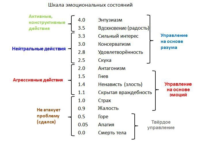 Сегодня я немного отвлекусь в теме развития эмоционального интеллекта от распознавания эмоций и переведу фокус на то, как можно развить так называемое "денежное мышление" без всяких инфоцыганских мантр, сектантских установок и забросов красных трусов на люстру. Не стану долго тянуть, беру сразу быка за рога: ваше "денежное" или "успешное" мышление напрямую зависит от вашего эмоционального тона. Сейчас все разъясню, давайте обратимся к мною любимой шкале эмоциональных тонов: Итак, какая здесь взаимосвязь? - спросите вы. А вот какая: чем выше тон, тем больше энергии формулирования и реализации своих "хочу", будь то желания или потребности, выше базовых (которые обеспечивают нам выживаемость, но это тема отдельной статьи, так что не буду разворачивать). Так с какой же эмоции начинается денежное или успешное мышление? Давайте разберём все основные и начнём снизу по шкале: 0,005 Апатия. Это состояние, когда человек ничего не может, кроме как существовать. У человека нет желаний, а значит