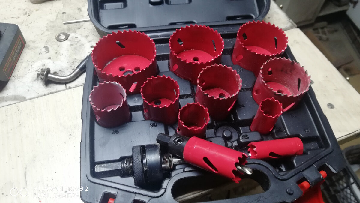 Прожечь его мне было нечем, поэтому решил попробовать в работе коронки по металлу. Начать я решил с биметаллических коронок, набор которых я приобрел пару месяцев назад. Дерево они сверлят просто замечательно, осталось их проверить на металле. Сначала я просверлил 5 мм сверлом центральное отверстие, по которому затем шло осевое сверло коронки. Поначалу работа пошла очень даже хорошо. Сверлить старался на минимальных оборотах, которые позволяет дрель, плюс обильно проливал зону реза маслом. Но примерно на 4 мм заглубления резать сверло практически перестало. Внимательно его осмотрев, я увидел, что наружные зубья (а они имели разводку "через один") были сточены, то есть, разводка была утрачена Подозреваю, что я переборщил с оборотами, но дрелью дать обороты меньше я не мог - сильно проседала мощность и дрель чрезмерно грелась. Так что досверливать отверс