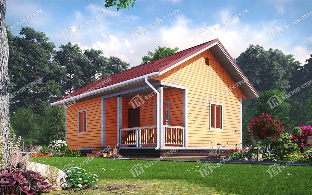 Климент – одноэтажный дом с террасой, из профилированного бруса, общие размеры – 6х9м. Планировкой предусмотрено 2 просторные спальни, санузел и кухня. Терраса с перилами и балясинами размером 1,5х4,5 м., при входе устанавливаются ступени. • Площадь: 54 м2