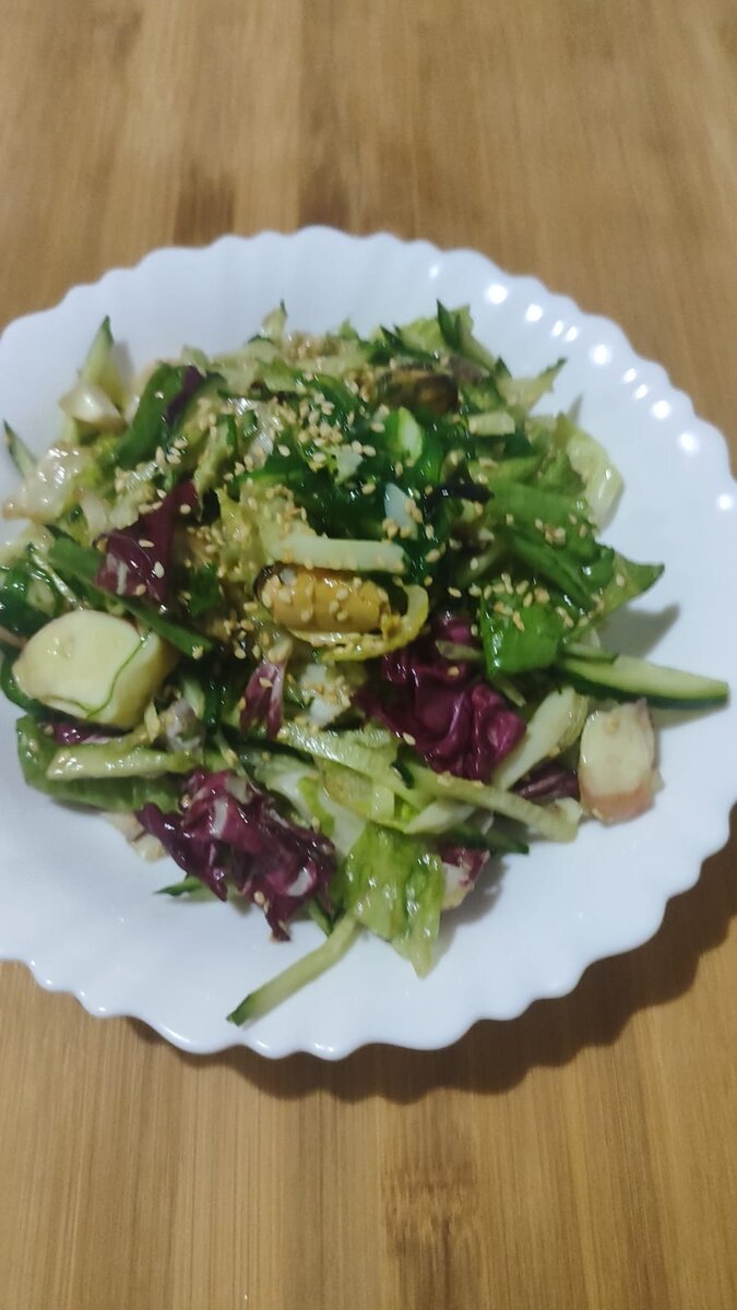 В миску выкладываем микс салат и морепродукты, далее один короткоплодный свежий огурец, нарезаем тонкой соломкой и добавляем в салат