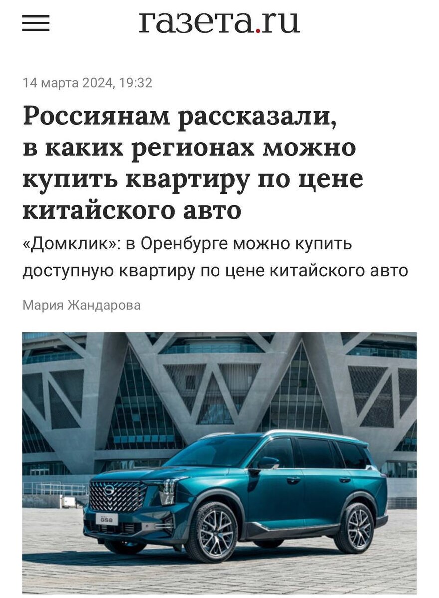 Например, в Оренбурге можно купить квартиру по цене китайца GAC GS8 (3,8 млн), а в Питере – по цене китайского аналога BMW X6 (~7,5 млн)