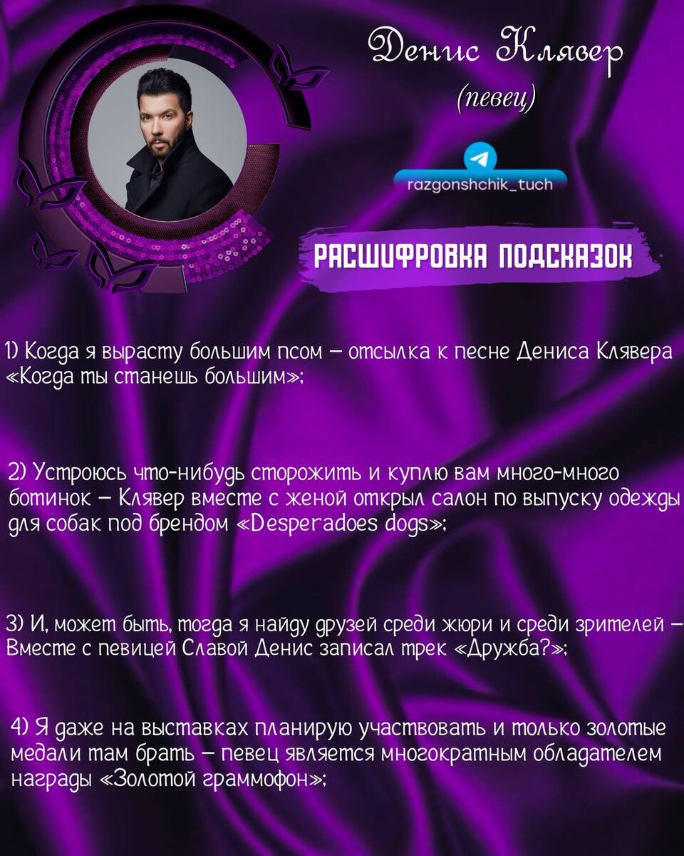 Щенок – Денис Клявер (1-3 выпуск) Мы к Вам не с пустыми руками. Напомним, что несколько недель назад, мы предположили, что помимо Алексея Чумакова, в маске щенка может скрываться Денис Клявер. И, конечно же, эта версия понеслась по просторам интернета также, как и версия Алексея Чумакова. Мы уже говорили, что Алексея Чумакова в Щенке может и не быть, так как его озвучки мультфильмов не сходят со списком, данным НТВ. Их слишко много. Поэтому мы начали искать нового кандидата на данную маску. Мы посчитали, что под Щенком может скрываться Денис Клявер. Маска отлично скрывает рост, а петь фальцетом, судя по шоу «Один в один» Денис может. #расшифровки
