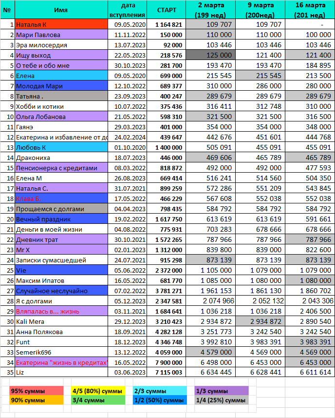 Всем привет! Сегодня уже понедельник, я добралась до компьютера и, не теряя времени, с удовольствием подвожу итоги очередной недели нашего Марафона. И у нас новость: участница Наталья К. покидает марафон! Я неоднократно писала, что участники, вышедшие из марафона делятся на два типа: те, кто дошел до конца, погасив долги, и те, кто сошел с дистанции по каким-то другим причинам. Если помните, то в итогах года я таких участников выделяла в таблице желтым и серым цветом соответственно. Вот формально Наталья выходит из Марафона с остатком долга. Но ради неё я хочу сделать исключение и записать так, будто долг полностью погашен. Потому что: во-первых, долг ипотечный, под мизерный процент, и не напрягает. Во-вторых, имеются накопления, которые в принципе можно считать за уменьшение долга. Ну а в третьих, достаточно посмотреть, с какой суммы Наталья начинала марафон! По сравнению со стартом, до финиша рукой подать! Поэтому сегодня мы поздравляем Наталью с успешным завершением марафона! Совсем