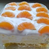 Нежный торт-суфле из творога и яиц, с апельсиновым желе и сметанным кремом, готовится без грамма какой-либо муки. Вместо сахара используется порошок стевии. Никто из пробовавших ещё не догадался, из чего приготовлены коржи для торта. Этот белковый десерт можно есть кто на диете. Продукты (на 4 порции) 1. Из апельсинов выжимаем сок. Заливаем соком 1 ст. ложку желатина в сотейнике. Оставляем для набухания минут на 10. 2. Затем ставим сотейник на средний огонь и, помешивая, доводим до полного растворения желатина. Снимаем с плиты. 3. Выливаем апельсиновый сок с желатином в стеклянную форму, в которой будем собирать торт. Размеры моей формы - 14х19 см. Даём остыть до комнатной температуры, затем помещаем форму в холодильник для застывания желе. 4. Включаем духовку для разогрева до 160 градусов. Противень (размером 30х30 см) застилаем силиконовым ковриком. Можно использовать и хороший промасленный пергамент, но если пергамент обычный, корж снять с него будет практически невозможно. 5. Яйц