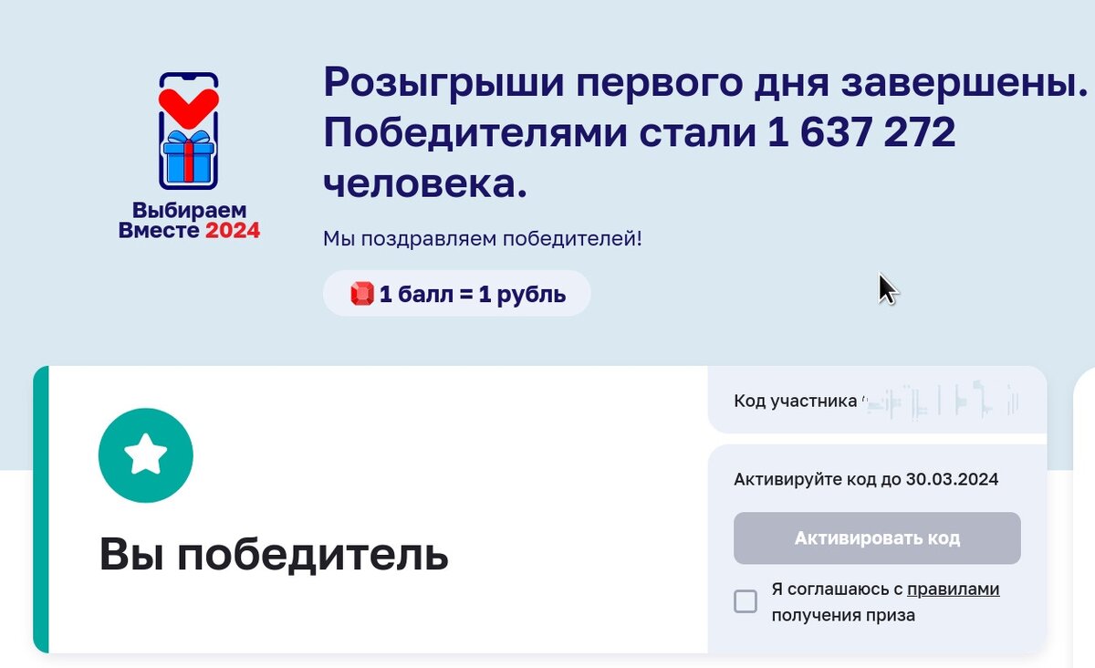 Всем доброго дня! Сейчас в России проходят выборы Президента. И многие регионы проводят свои розыгрыши и викторины. Друзья, заранее прошу поддержать лайком и подпиской, если ещё не подписаны. Именно эти действия помогают каналу развиваться и не пропускать новые публикации! Всем заранее огромное спасибо! Вчера читала, что есть счастливые обладатели машин и квартир) Очень рада за людей, если это реально простые люди, а не "рекламная компания". Мы живем в Москве, давно голосуем дистанционно, очень удобно, экономит время. В Москве, среди голосовавших разыгрываются баллы, умные колонки..еще что-то. Мы проголосовали в первый день и вчера нам пришли смс и мне и супругу, что мы стали победителями!!! Забавно-никогда ничего не выигрывали))))))) И я и супруг стали обладателями призов по 1000р Это минимальная сумма, но приятно))))))) Сумма небольшая, ее же надо еще и потратить))))