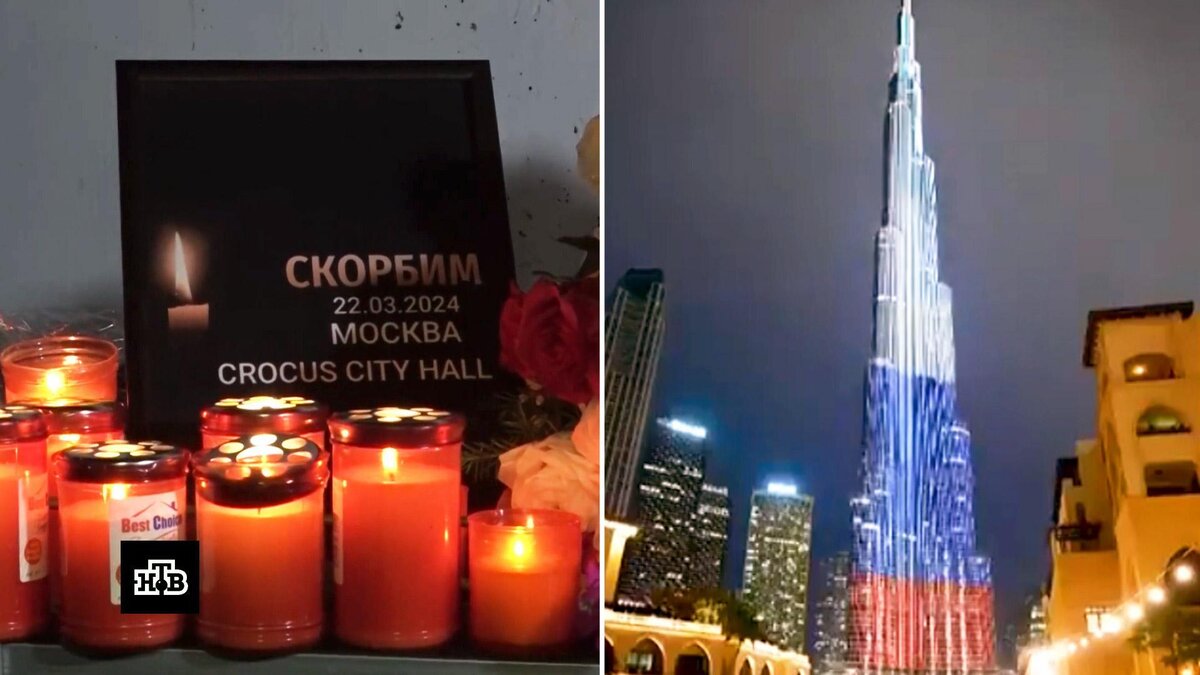 Минувшей ночью самое высокое в мире здание — небоскреб Бурдж-Халифа в Арабских Эмиратах − окрасился в цвета российского триколора. То же сделали и на других знаковых высотках Дубая.