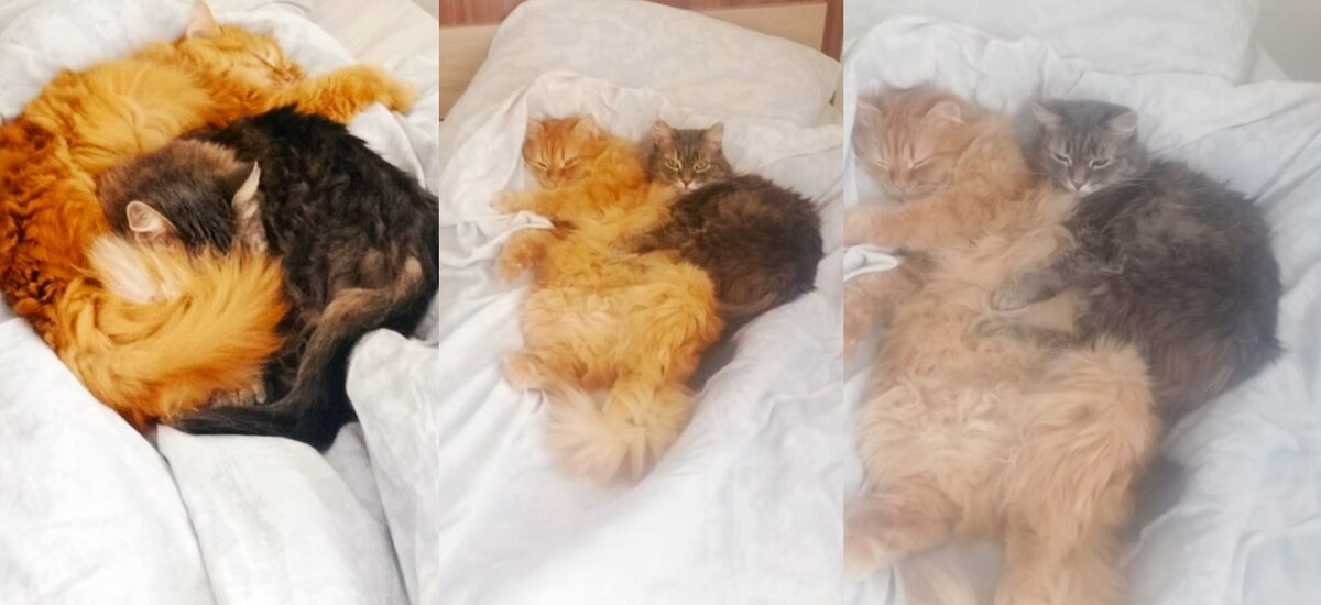 Из Томска от Ричи, Роника и Муси нам пришёл привет из шести вертикальных фоток. Мы их скомпоновали в триптихи.