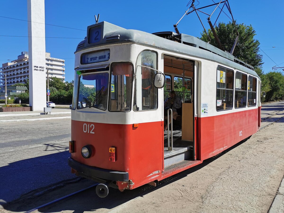 Евпатория единственный город в Крыму, где еще сохранилось трамвайное движение. В городе действует 4 трамвайных маршрута, общая протяженность трамвайных путей около 20 километров. На маршруте №2, который проходит по курортной зоне, ходит старый немецкий трамвай "Gotha". Вагон Gotha T57 № 012 построен в 1960 году в немецком городе Гота, на заводе «Wagonfabrik Gotha», который выпускал трамваи для ГДР и СССР в 1950-60-х годах. До 1971 года он эксплуатировался в Симферополе под номером №159, после чего был передан в Евпаторию. В начале осени 2021 года я специально прокатился на нем по маршруту №2 от Гортеатра до Мойнаки и обратно. Пока мы стояли на конечной остановке, я сфотографировал кабину вагоновожатого. Вагон несколько раз проходил капитальный ремонт, поэтому внутренняя отделка вагона уже современная, правда сиденья оставили деревянными. Насколько мне известно, маршрут номер №2 функционирует во время курортного, на зиму его закрывают. Предлагаю совершить виртуальную прогулку на этом
