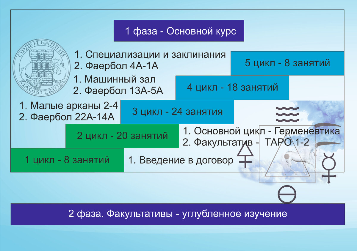 Основной курс длится год. Каждая ступенька в нем вытекает из предыдущей. Это целостный курс. Мы достаточно бегло проходим по всем значимым темам в магии и таким образом мы отражаем саму модель магов в сознании, получив какой-то поверхностный опыт в каждом цикле.