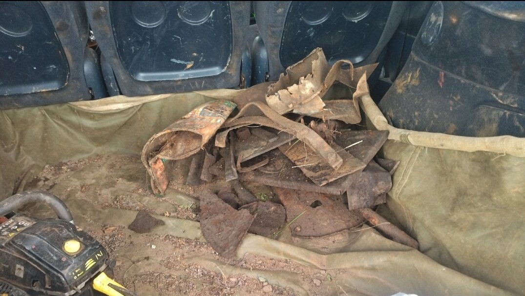 Так вот, нарвались в одной ямке на кровать железную, её спинку (только одна была), три седла (2 от мотоцикла и одно велосипедное), алюминиевый провод и ещё много всякого мусора.
