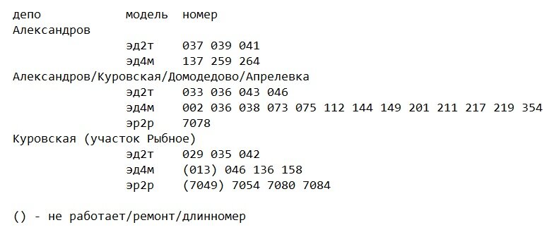 И как всегда в конце личная добавочка от меня по коротышам до шести вагонов, работающим вокруг Москвы. Изменений немного. Сцепились в длинномеры на главный ход александровские ЭД4М-0102 и 0161. До сих пор не очень понятно, сцеплена ли ЭД4М-0013 на полный размер, или по-прежнему работает в Рыбном, точной инфы ноль, а та, что есть, противоречива. А остальные все, вроде на своих местах, кроме ЭД4М-0067.