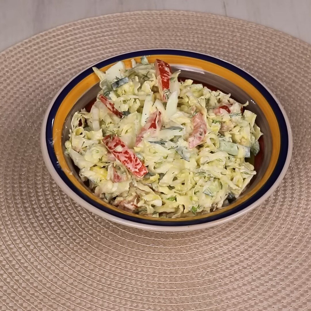 Заправляем нарезанные овощи яично-сметанной заправкой и перемешиваем.