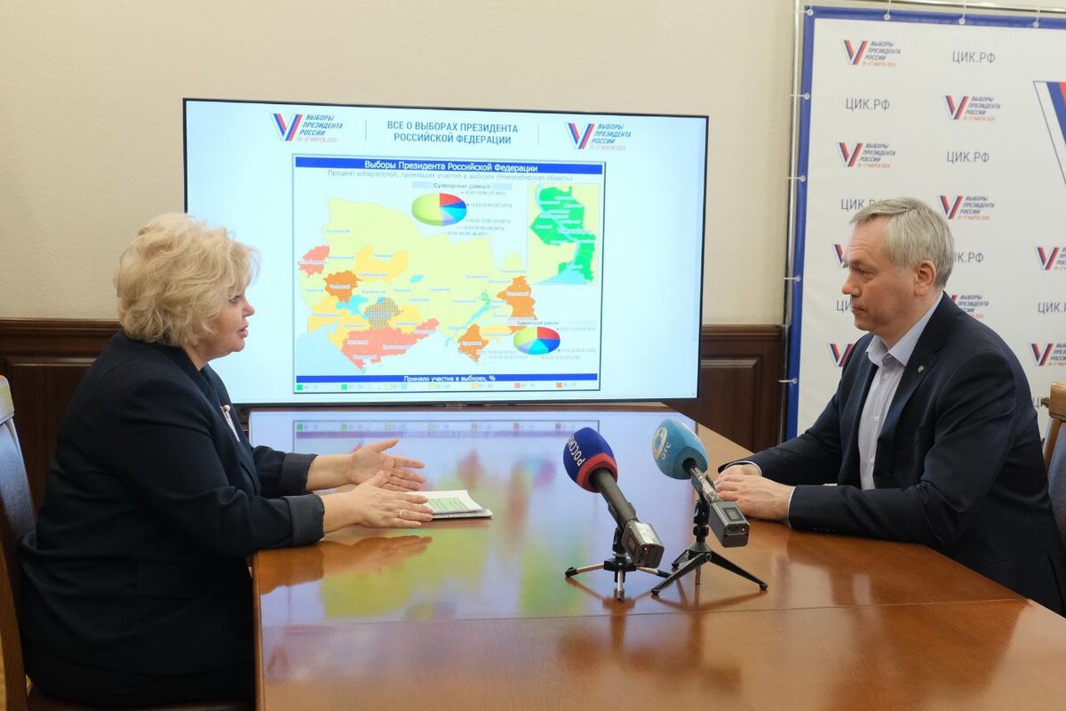 Председатель Избирательной комиссии Новосибирской области Ольга Благо представила главе региона доклад о ходе выборов президента России в регионе.