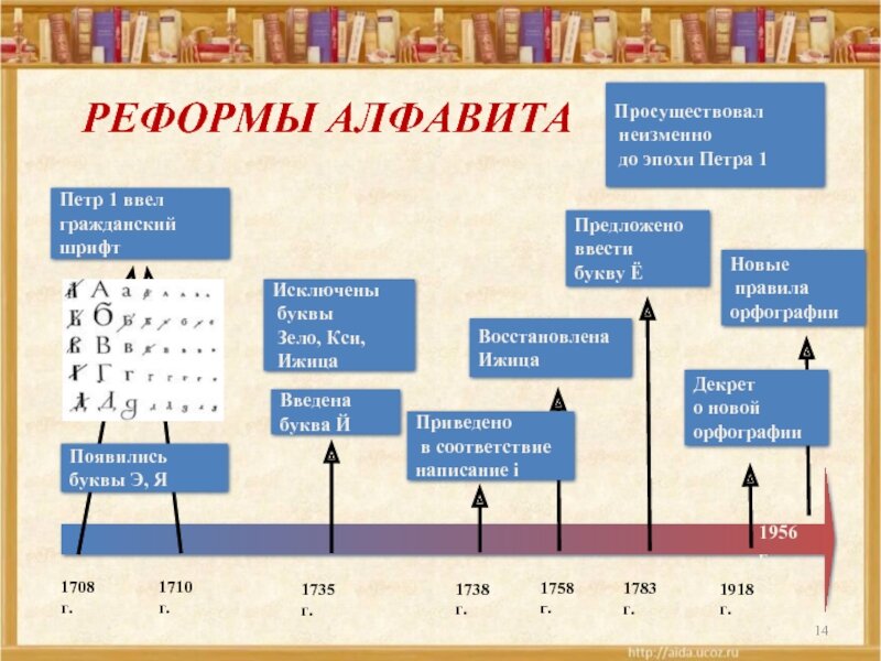 1. Петровская реформа языка 1708-1710 гг. Пётр I внедрил новый шрифт — гражданский (гражданку). Значительно сократилось число букв, из орфографии исчезли декоративные элементы. Письмо стало менее красивым, но легче читаемым.