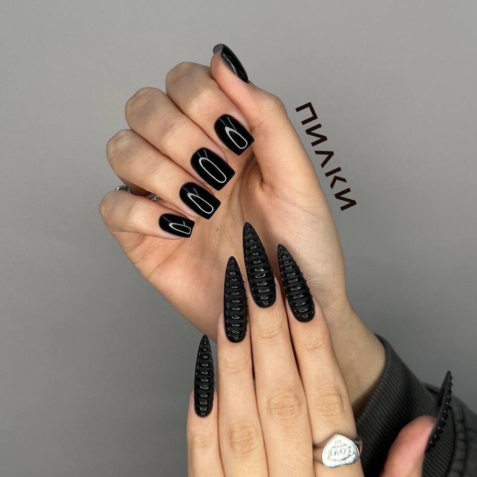 В постоянно развивающейся вселенной нейл-арта на горизонте появилась новая звезда, мерцающая дерзостью и очарованием. Это тренд на маникюр в стиле «треш»! И прежде, чем вы позволите названию сбить вас с толку, мы постараемся переубедить вас и доказать, что такой нейл-арт — сокровище, которое ждет вашего пристального внимания. Больше интересного в телеграм канале Эта тенденция — способ отличаться от других, выйти из своей зоны комфорта и сказать «да» экспериментам с ногтями. Речь в ней идет о неортодоксальных дизайнах, бросающих вызов привычному и обыденному. Нашли пять идей «безумного» маникюра, которые вы сможете повторить. 1. Игра контрастов Представьте себе, что ногти одной руки сияют гладким черным глянцевым покрытием, а их форма — удлиненный квадрат. Теперь посмотрите на другую руку, и вы обнаружите, что там правит балом матовый финиш с изящными каплями, украшающими каждый ноготь. Они отчетливо напоминают вам когти дракона за счет острой формы стилета. Это же какая-то маг