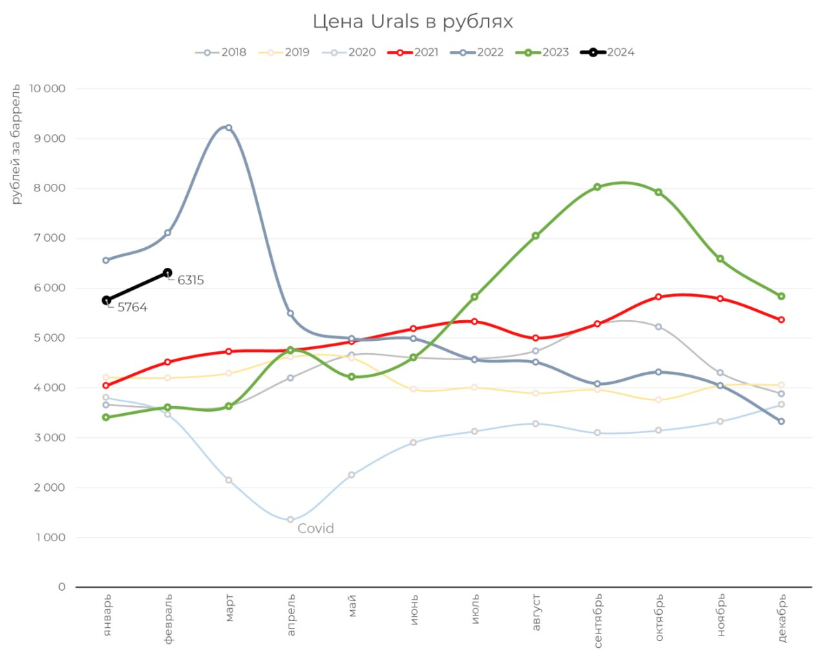 Продолжаем следить за рублевой бочкой Urals, чтобы примерно понимать положение дел у нефтяников в текущем квартале. Январь и Февраль начали очень хорошо. Цены на нефть марки Urals с учетом дисконта составили 65$ и 69$ соответственно. Курс рубля стабильно в районе 90. Отсюда имеем рублевую бочку 5764 в январе и 6315 в 6315 в феврале. Март, вероятно, будет еще выше, так как Brent в последнюю начал расти. Что касается демпферных выплат, который очень важны для переработчиков, то они также на высоком уровне. Примерно как в ноябре-декабре 2023 года и рекордные значения в январе-феврале. Исходя из всего выше перечисленного, первый квартал у нефтяников обещает быть отличным. В портфеле продолжаю держать Лукойл и Сургут прив. По Лукойлу позже сделаю разбор отчета за 2023 год.