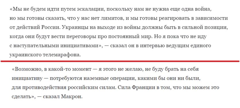 Если честно, то мы уже запутались в заявлениях Макрона. То он вводит свои силы уже завтра, то через час уже никогда не пойдёт против России. Далеко ходить не надо, вот заявления последних пары дней: