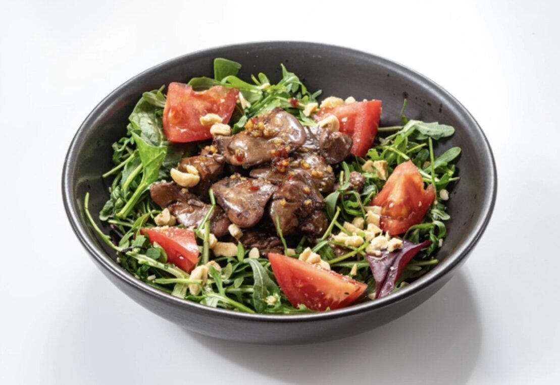 Ингредиенты 2 порции Мед 50 г Винный уксус 15 мл Тимьян 1 веточка Соевый соус 15 мл Имбирь 10 г Перец Чили ½ штуки Куриная печень 200 г Смесь салатных листьев по вкусу Фундук 15 г Помидоры 150 г Оливковое масло 20 мл Растительное масло 40 мл Соль по вкусу Инструкция приготовления 10. Украсить салат рубленым фундуком и подавать к столу.