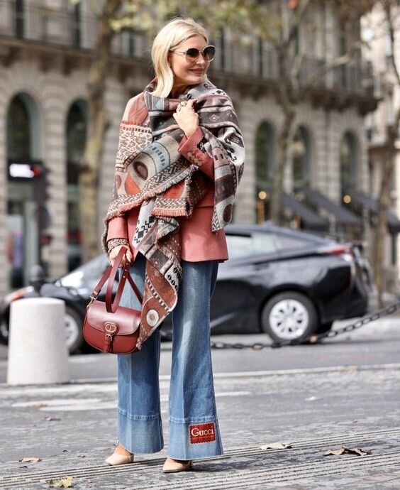 - Интересный ансамбль с джинсами. Джинсы выбраны расклешенные. К ним добавили черную шифоновую блузку с прозрачными рукавами с воланами по нижнему краю. А также твидовый жилет. Жилет с рисунком в клетку в бело-красно-черных тонах, в качестве отделки использован черный кант. К образу выбрали красные лаковые полусапожки и сумку красного цвета, но более светлого оттенка.