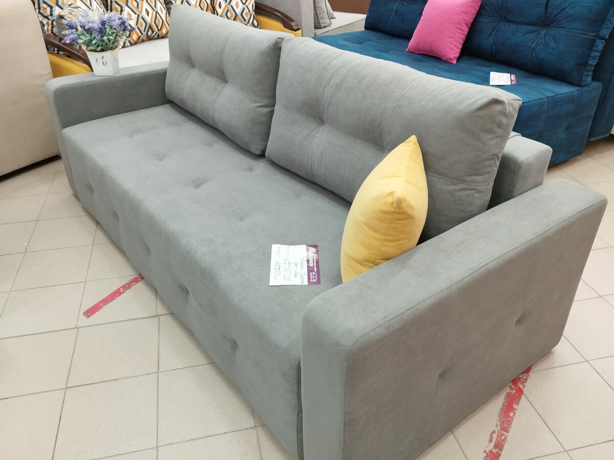 Мы уже шли на выход, и я хотела поехать ещё раз посмотреть на сиреневый диван, но тут увидела один диван, который внешне подходил всём моим требованиям.