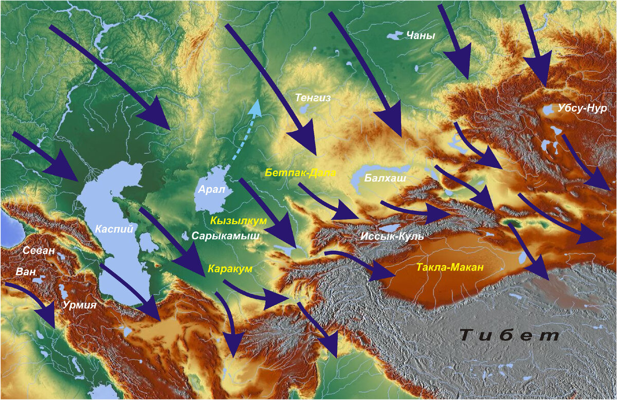Большинство солёных озёр Евразии сосредоточены в Центральной Азии на стыке равнинных и горных территорий, которые надолго были затоплены водами Всемирного Потопа около 2700 лет назад (Рис. 1). Причём здесь, на небольшом пространстве, сосредоточены все самые крупные из них, которые и войдут в этот обзор.