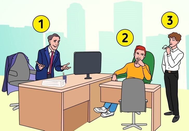 Знаете, если честно, ничего сложного в этой задачке нет. Правда, есть одно "но". Испытуемому на её решение даётся всего 9 секунд. Так что, подождите пролистывать страничку вниз, а лучше сначала приготовьте секундолмер, ну или просто часы с секундной стрелкой. Так сказать, "для чистоты эксперимента". И тогда можно будет судить - можете ли вы претендовать на место в какой-нибудь американской компании, или же придётся довольствоваться вашей нынешней работой. Цель - поверить ваше логическое мышление, которое самым непосредственным образом связано с уровнем IQ, что крайне важно, когда вакансия требует от человека молниеносной реакции в принятии решений. Хотя, если честно, как по мне, так она слегка попахивает немножко другим - умением безошибочно определять, кто из сотрудников на какой ступени иерархии находится. Впрочем, возможно конечно, что я и ошибаюсь. Итак, приступим. У вас есть 9 секунд, в течение которых необходимо определить, кто из трёх присутствующих на изображении на самом деле