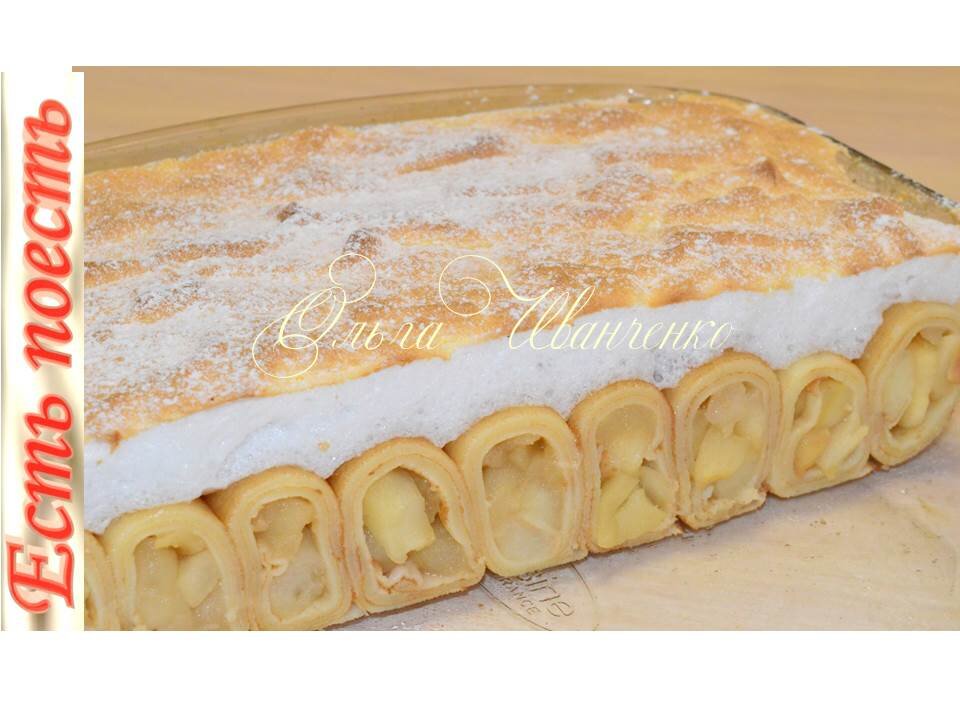 Блинный пирог с безе и яблоками сделан по мотивам известного десерта "соложеники". Нежнейшие блинчики со сливочным вкусом, хрустящая ароматная яблочная начинка, а сверху - воздушное безе. Такой десерт не может не понравиться! Пошаговый рецепт приготовления Отделить белки от желтков. В миске смешать венчиком желтки, сахар, соль, ванилин. Налить половину порции молока, всыпать муку и размешать до исчезновения комочков. Добавить оставшееся молоко и растопленное масло, перемешать. Испечь тонкие блинчики (у меня обычно получается 10-11 блинов диаметром 21см). Для начинки очистить яблоки и нарезать их небольшими кубиками. На сковороде растопить масло, выложить яблоки, сахар, ванильный сахар и корицу по вкусу. На интенсивном огне дождаться растворения сахара, непрерывно помешивая. Яблоки должны снаружи стать немного мягкими, а внутри остаться твёрдыми. Дать остыть. На блинчики выложить начинку, свернуть трубочкой и уложить в форму, смазанную маслом (у меня 20х20). Обычно помещается 9 трубочек