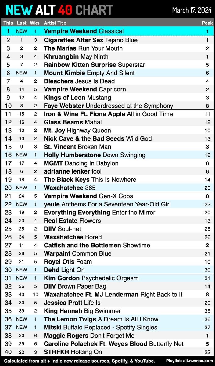 Еженедельно рассчитывается на основе десятков альтернативных и инди-новинок и потоковой активности на основных сервисах. Последнее обновление: 17 марта 2024 г.