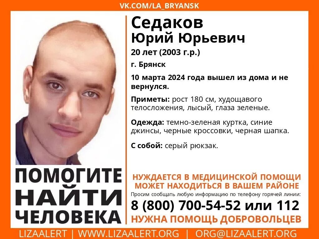 В Новосибирской области ищут 20-летнего Юрия Седакова из Брянска. Об этом сообщает поисковый отряд «ЛизаАлерт». Мужчина ушел из дома 10 марта 2024 года и не вернулся. Уточняется, что он нуждается в медицинской помощи. Приметы пропавшего: рост 180 см, худощавого телосложения, лысый, глаза зеленые. В день исчезновения был одет в темно-зеленую куртку, синие джинсы, черные кроссовки и черную шапку. С собой у него был серый рюкзак. Если у вас есть какая-либо информация о местонахождении Юрия Седакова просьба позвонить по телефонам 88007005452 (горячая линия ЛА) или 02, 102 (полиция). Вячеслав Зубарев
