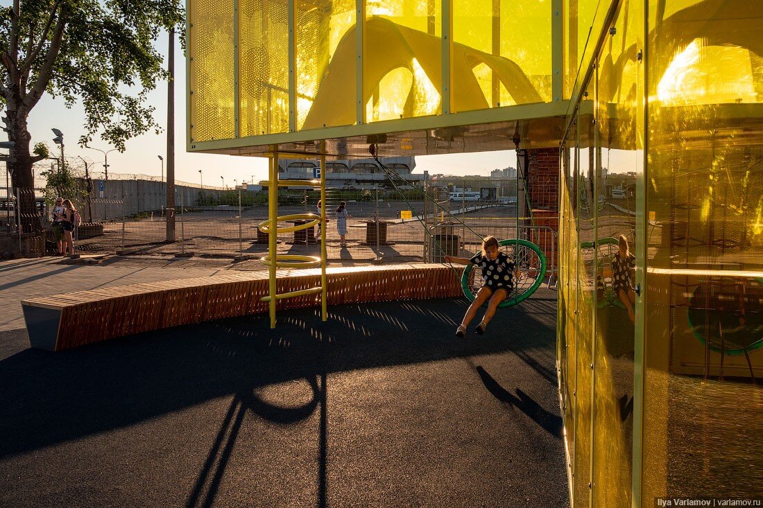 21. Очень круто, что при благоустройстве попытались максимально сохранить локальную идентичность. Здесь не уничтожили объекты и элементы бывшего завода, а постарались их использовать в благоустройстве, переделать в арт-объекты, из-за чего общественное место теперь имеет свое лицо. И это действительно круто.
