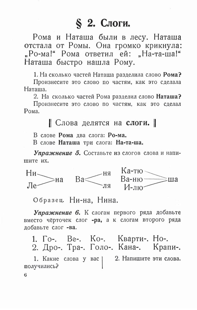Русский язык 1 класс В период обучения грамоте ученики практически уже делили слова на слоги. Теперь надо обратить внимание детей на то, что в каждом слове столько слогов, сколько выдохов делается при произнесении слова. Сами дети легко могут убедиться в этом. По указанию учителя каждый учащийся прикладывает к подбородку кисть руки тыльной частью и начинает произносить слова: односложное, двухсложное, трехсложное и четырехсложное. Эти слова можно заранее написать мелом на классной доске. Сколько раз подбородок опустится и ударит в кисть руки, столько слогов в произносимом слове. Из других приемов можно рекомендовать следующие: а) деление слов (например, Маша) на части с одновременным наблюдением над тем, как работают губы и рот при произнесении этого слова (показ учителя, показ самих ребят друг другу); б) деление слова на части только на слух, при закрытых глазах (ра-ма); в) выделение зрением в разных специально подобранных и написанных на классной доске словах одного и того
