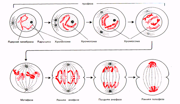 Митоз - тип клеточного деления, в результате которого дочерние клетки получают генетический материал, идентичный тому, который содержался в материнской клетке. Митоз состоит из четырёх фаз.
