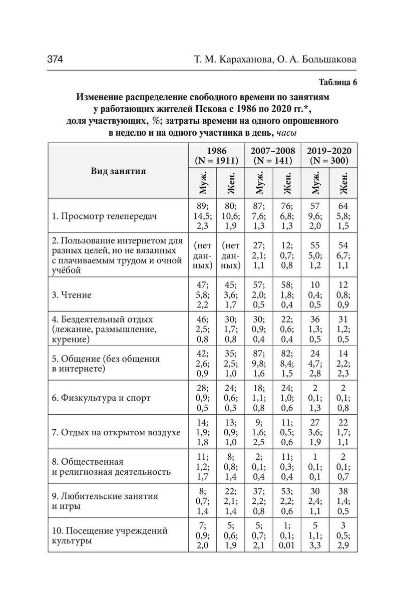 Попалась интересная таблица. Как менялось распределение свободного времени с 1986 года, правда, на примере г. Псков. Допустим, что можно экстраполировать данные и на жителей других регионов.