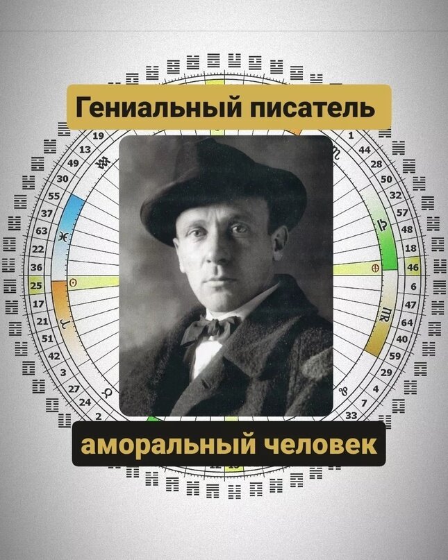 Дизайн Булгакова насыщен противоречиями. Там есть холодная логика, мощная эмоциональность, яркая спонтанная индивидуальность, стремление к постоянству, традициям и поддержке. Булгаков ушёл в 49 лет, буквально за полгода до начала своего цикла возврата Хирона, когда человек по-настоящему получает возможность не только раскрыть уникальный потенциал, но ещё и стать внешним авторитетом в теме своего инкранационного креста.