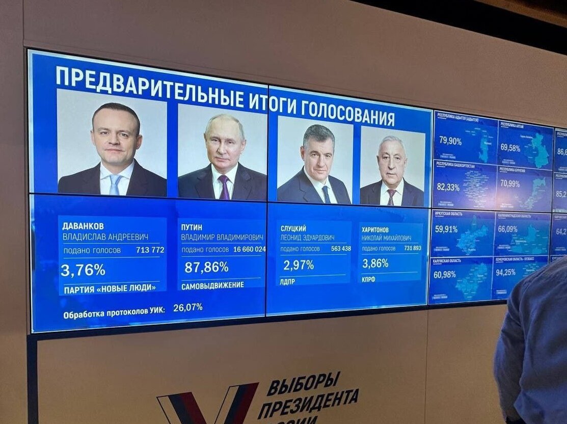 Выборы в России завершились! Владимир Путин набирает более 87% голосов после подсчёта более 25% протоколов!Харитонов - 3,86%Даванков - 3,76%Слуцкий - 2,97%