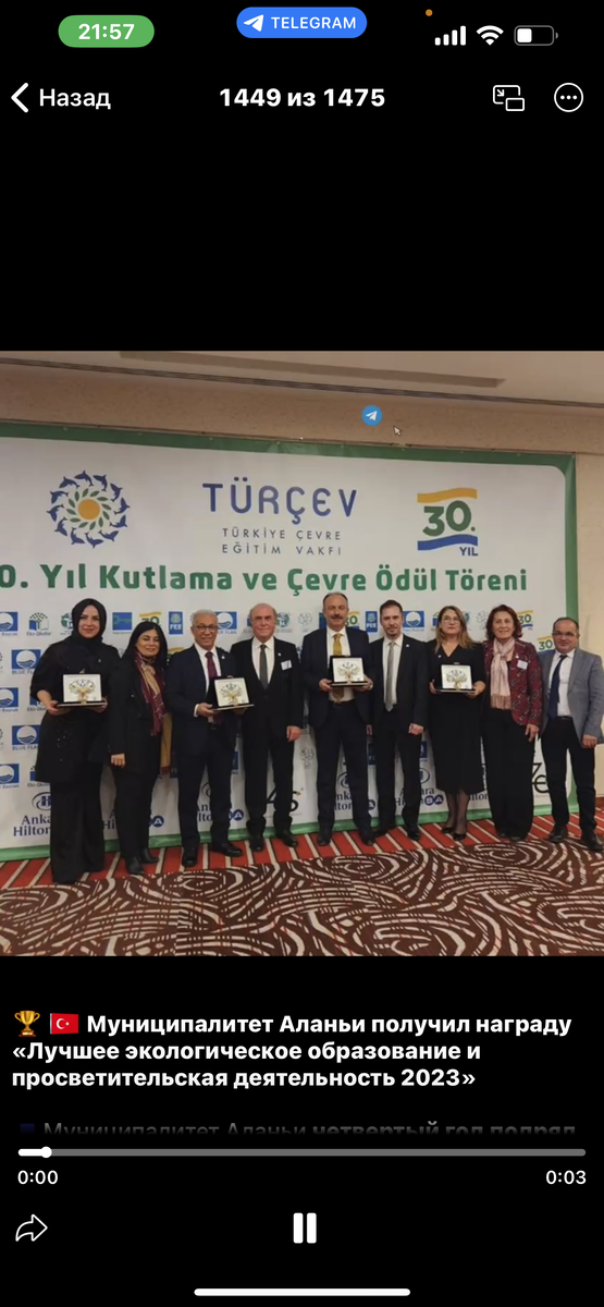 Муниципалитет Аланьи получил награду «Лучшее экологическое образование и просветительская деятельность 2023». Аланийский муниципалитет — один из семи столичных и районных муниципалитетов, которые получили эту награду. В рамках проекта Аланья также получила награду «Экологический город Аланья". Эта награда была присуждена за экологическую деятельность и проекты, соответствующие целям, определенным Программой развития Организации Объединенных Наций (ПРООН) в области защиты морей и побережий в 2023 году. Церемония вручения наград состоялась 9 марта в отеле Ankara HiltonSA в рамках празднования 30-летия Турецкого фонда экологического образования. В состав экспертного жюри вошли представители Министерства культуры и туризма, Министерства окружающей среды, урбанизации и изменения климата, а также ученые из различных университетов. Награду вручил Совет директоров TÜRÇEV, а получила ее менеджер по охране окружающей среды муниципалитета Аланьи Севде Чапе. Кроме того, отель Rubi Platinum, пр