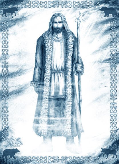 Длинна борода его, узорочьем вышита шуба и посох кривой с головой медвежьей из дерева выточенной. А глаза, словно звезды сияют.