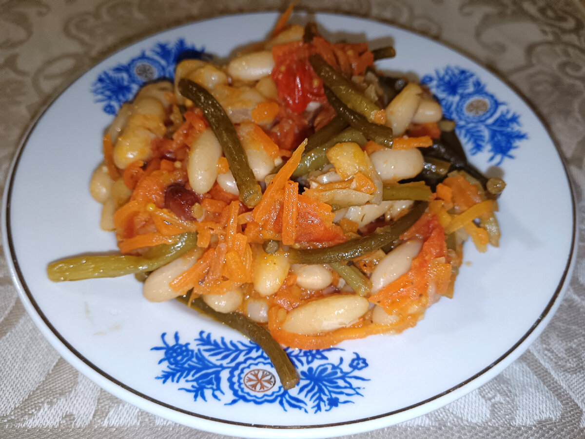 Здравствуйте, дорогие мои! Совсем недавно казалось, что столько у нас праздников впереди, только 23 февраля отметили, как 8 марта подоспело и плавно перетекло в Масленицу. Но не успели глазом моргнуть как закончились все праздники и теперь ждём Пасху. И это только кажется, что так далеко - 5 мая, думаю тоже и оглянуться не успеем, как будем вспоминать рецепты самых лучших куличей. Но пока пост. Придерживаться или нет, как именно придерживаться - личное дело каждого. И конечно пост это не диета и не способ экономии, еда в нем не главное. Мы постимся первую неделю и планируем последнюю, перед Пасхой. Поэтому сегодня речь о меню без продуктов животного происхождения. Оно у меня получилось очень простое и сытное, чтобы лишнего о еде не думать. В основе - фасоль. Замочила, отварила, потом основную часть потушила с морковью, луком, помидорами и ещё чесночных стрелок добавила. Очень сытное блюдо получилось, да и чего уж там, вкусное. Вспоминаю консервированную фасоль в томатном соусе, как