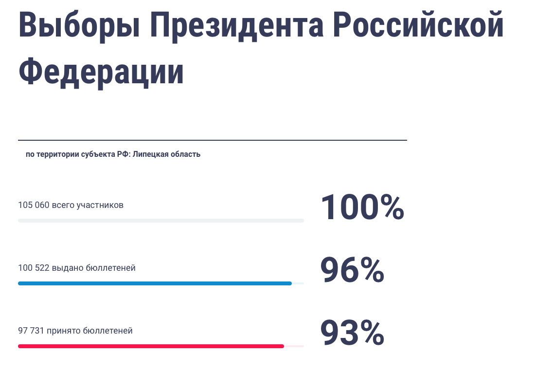 97 731 избиратель Липецкой области, зарегистрированных в ДЭГ, отдали свои голоса до 20:00 по данным на 17 марта. Это 93% от общего числа зарегистрированных. Всего в системе ДЭГ зарегистрировались 105 060 жителей Липецкой области. Напомним, по данным на 6 часов вечера явка на выборы президента России в Липецкой области составила 74,56%, с учетом проголосовавших в ДЭГ. По данным ЦИК, явка на выборах по всей стране уже к 15:00 превысила показатели голосования 2018 года. 17 марта в 20:00 в Липецкой области закрылись все 844 избирательных участка. Из них 833 —работали все три дня выборов президента России, а 11 избирательных пунктов были временными и открылись только в заключительный день голосования.