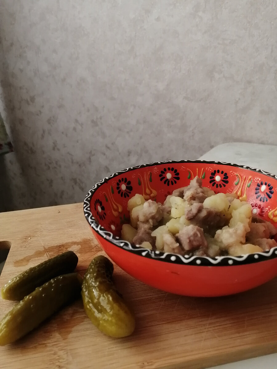 Я отношу себя к любителям специй и пряной пищи, но есть несколько блюд, куда всякие приправки добавляются мной в ограниченном количестве. Это одно из них. Как готовить, читайте в статье ниже. Берём На 3-литровую кастрюлю: Картофель — 12-14 средних штук; Свинина — 500-700 грамм; Лук — один штук; Из специй — лавровый лист, перец чёрный молотый, сушёный укроп, соль. Готовим Картошку и свинину режем небольшими кусочками. Первое оставляем на время в холодной воде и сначала отправляем вариться мясо. Заливаем его водой так, чтобы уровень воды был выше уровня мяса где-то на 1-2 пальца. К нему кладём чищеную луковицу. Её минут через 40 вылавливаем. Это вариант для таких, как я. Кто лук не ест и потом из блюда ковыряет. Если же его вы едите, то можете нарезать мелко и отправить к мясу чуть позже. Свинина у меня была домашняя, поэтому варила я её долго. Я люблю, когда мясо максимально растомлёное и тает во рту, поэтому до запуска картошки держала его больше часа на небольшом огне. Когда мясо «д
